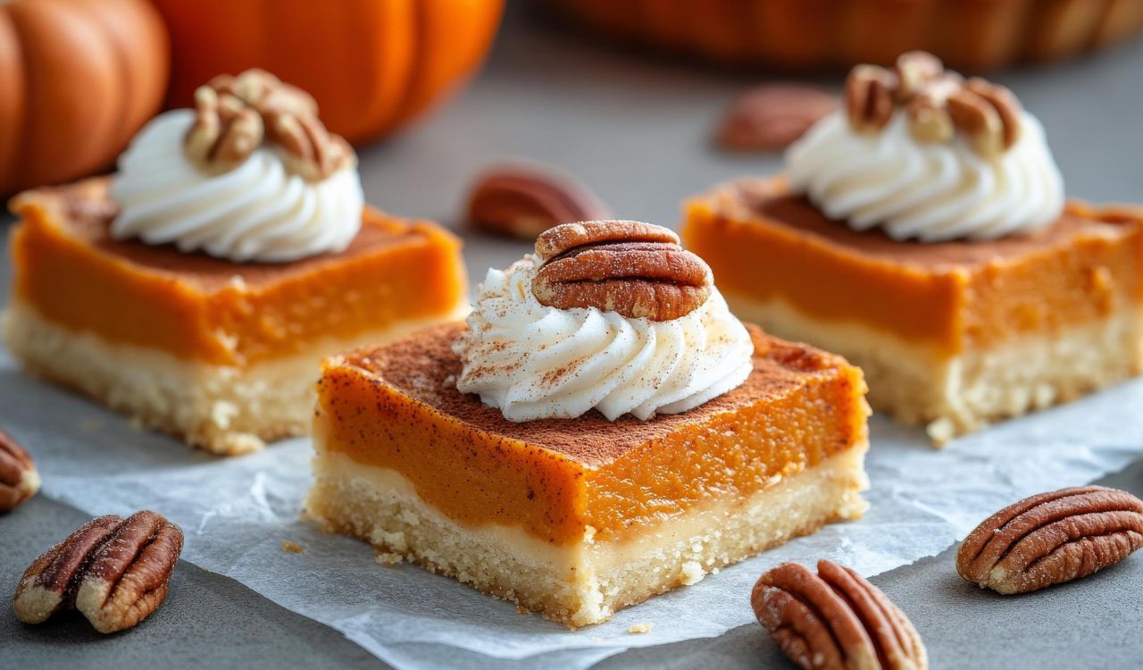 This creative dessert transforms classic sweet potato pie into a one-pan wonder. The smooth filling features mashed sweet potatoes, vanilla, cinnamon, and a hint of orange zest for brightness. A buttery crust holds it all together, while a pecan crumble topping adds crunch and contrast. The bars bake into firm yet creamy slices that hold their shape beautifully. Serve them chilled with whipped cream or warm with a drizzle of caramel for a dessert that feels both traditional and fresh.